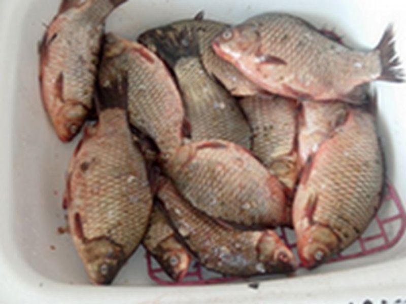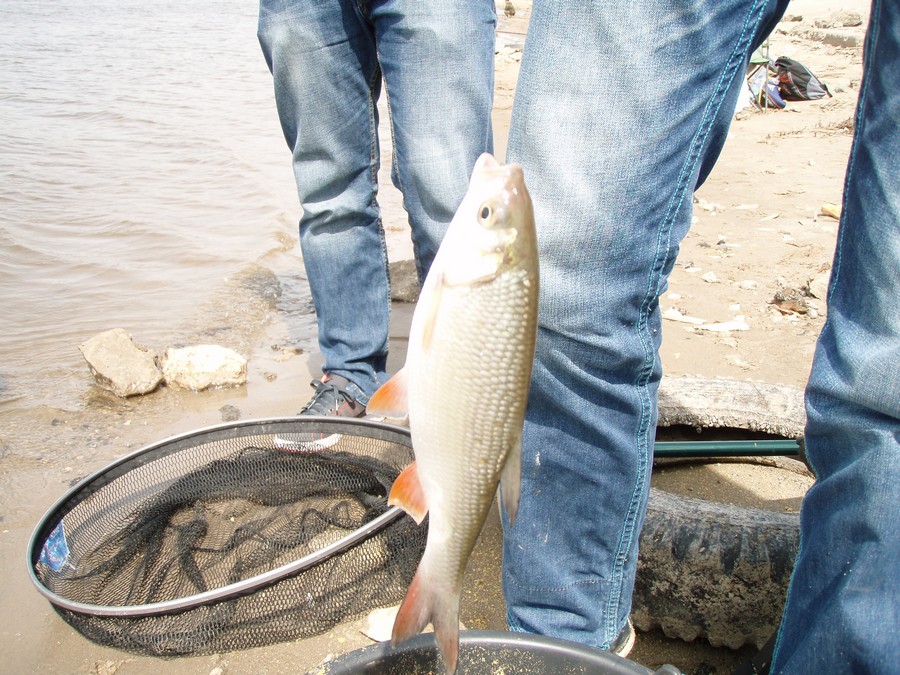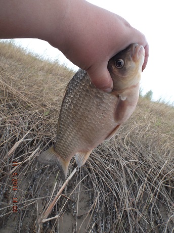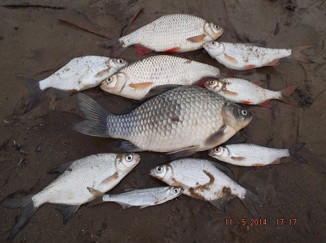 У Айдара попался судачок на 300 гр. Сначала думал ЛЕЩА тащит. Ан нет. Правда позже 1 лещик всё таки попался на крючок Айдару, но до берега не доплыл пару метров. Поймал я 1 плотву шипованную и с наростами на голове и чешуйках. 1 язишка попался у Айдара. На двоих поймали 3,5 кг.