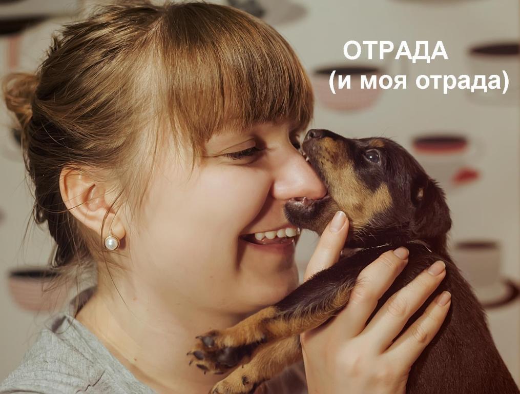 Самая нежная и миловидная (поэтому и имя такое же - нежное, как матра Оммм), но при этом первой научилась рычать, тяфкать и кусаться (до сих пор в руках брыкается и недовольно ряфкает). Моя любимица. Кинолог сказала - шоу собака, очень фотогенична, отличные пропорции.