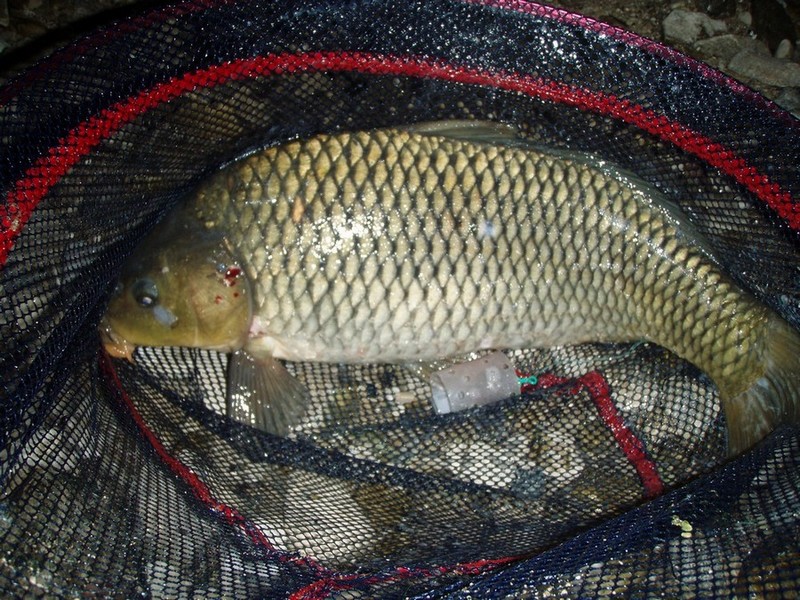 Короче поклёвки перестали. Уже стало светать. Как вдруг... Я заметил шевеление кукурузной" вершинки, для которой я к этому времени тоже сократил дистанцию примерно на 30 м от берега. Причём вершинка шажками отходила понемногу к берегу. Подсекаю. Тама тяжесть. Упирается не дерзко, но жёстко. А там 3 кукурузки на Камасане № 8 и поводок из плетни (надоели срезы). Ближе к берегу понимаю, соперник серьёзный. Стою с сачком. Он ещё переворачивается. Замечаю, что плетня за верхний напильник его зацепилась. Думаю, щас отпилит. Но нет. Вытащил таки пузатенького. Благо фриком нормально работал. Думаю, достойная компенсация за отсутствие клёва и 4 потерянных кормухи. Поудив полчасика я свернулся.