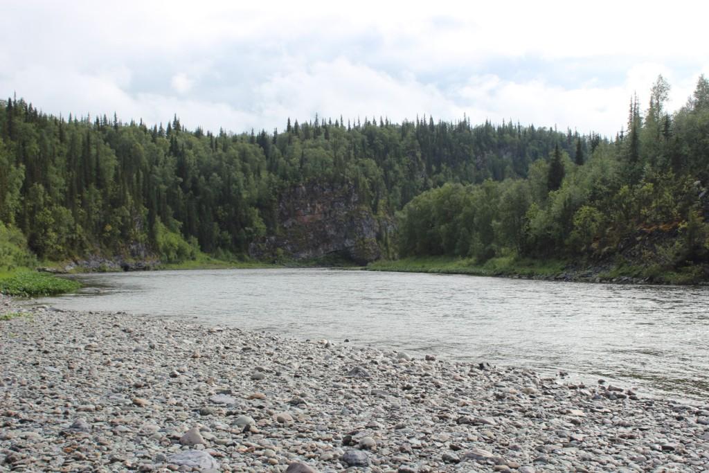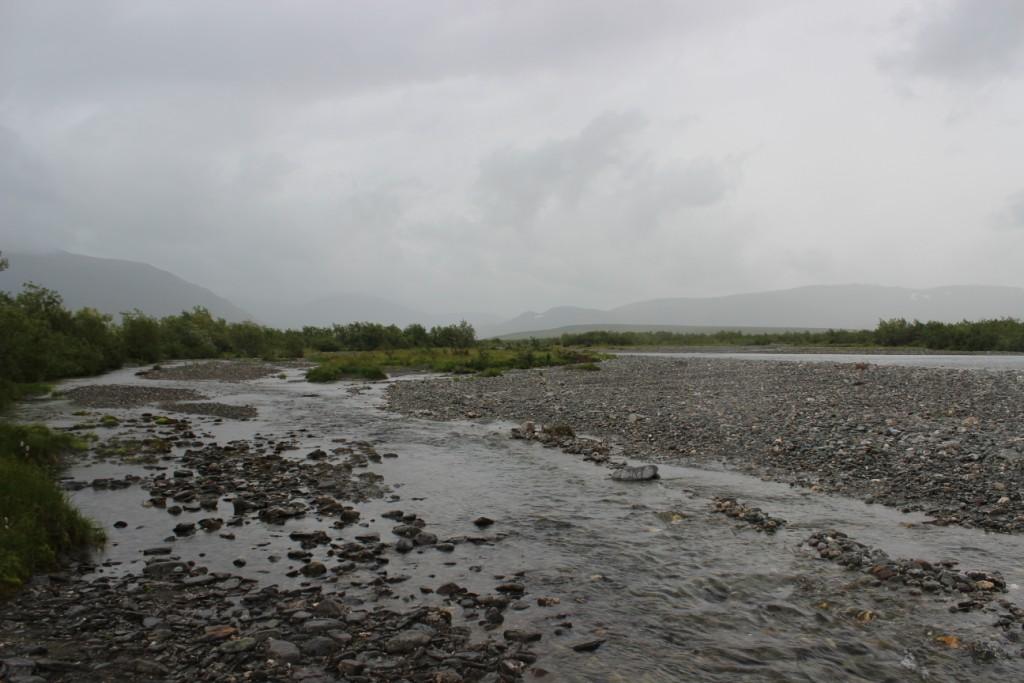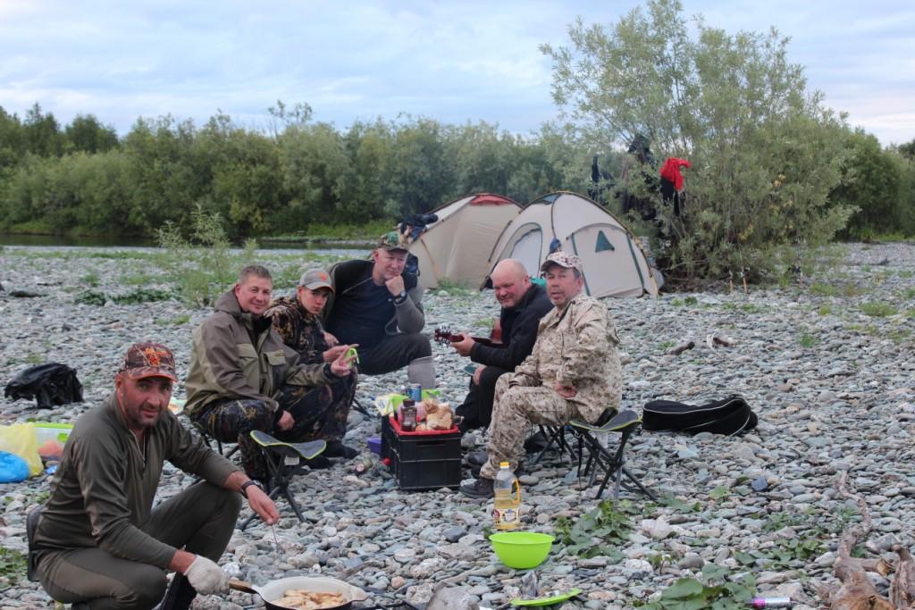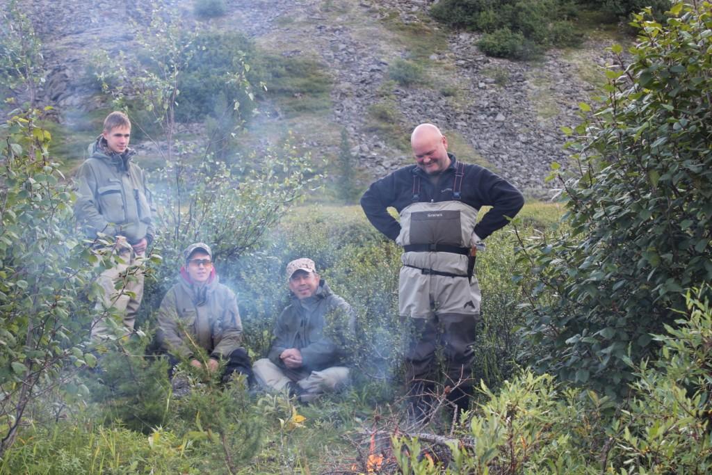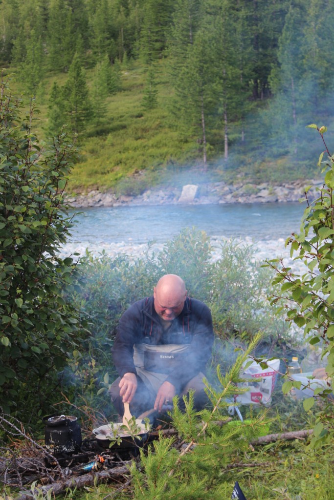 Возникла необходимость подтянуть гуслю, поэтому остановились на островке посреди какой то речки, решив заодно пообедать. Часть народу ушла рыбачить, Хоттабыч поймал первого хариуса и по традиции искупался.