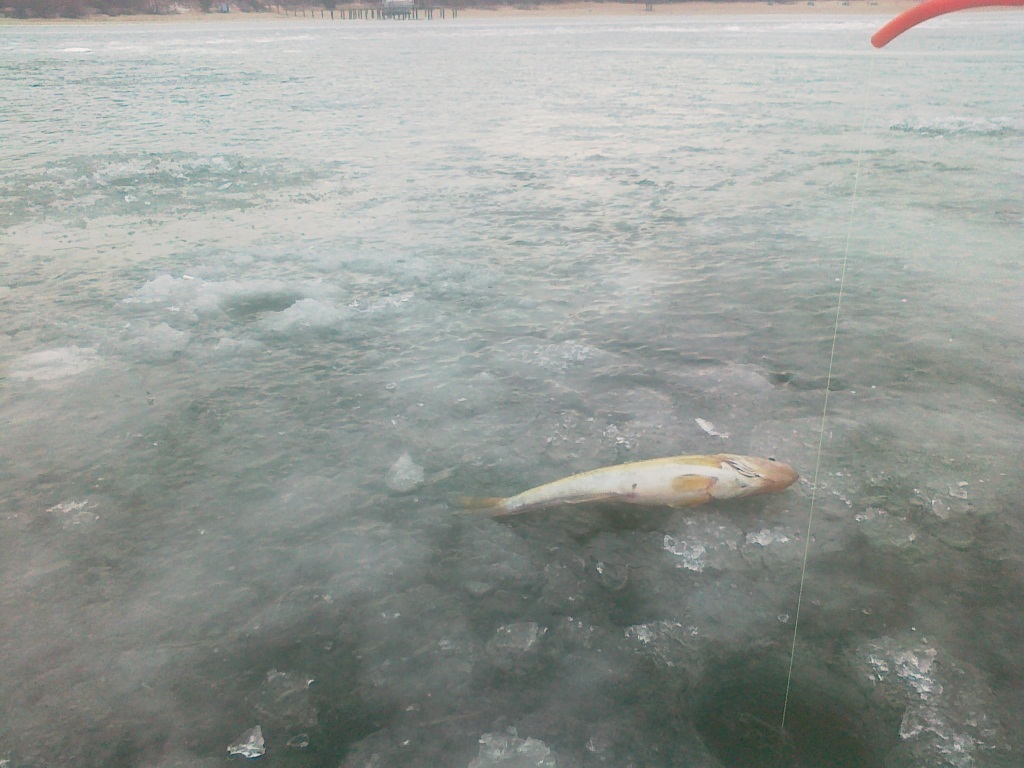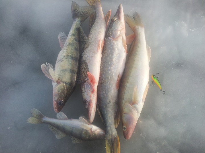 . Прошлись по старым точкам. Тяга сильная, погода хорошая, ветер подарочный. Кое где много льда по берегам, и мешают рыбачить плывущие льдины. Судак присутствует , но очень трудовой, в прилове щука и налим. Рулит зелёная резина с блёстками и черно-зелёная мандула.