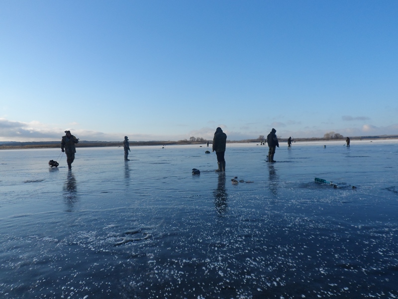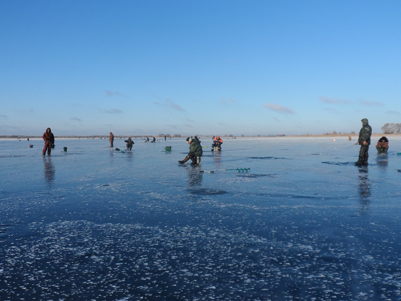 Толпа человек 15 на льду. Лед очень стремный 7-8 см. Заходил строго по следам.