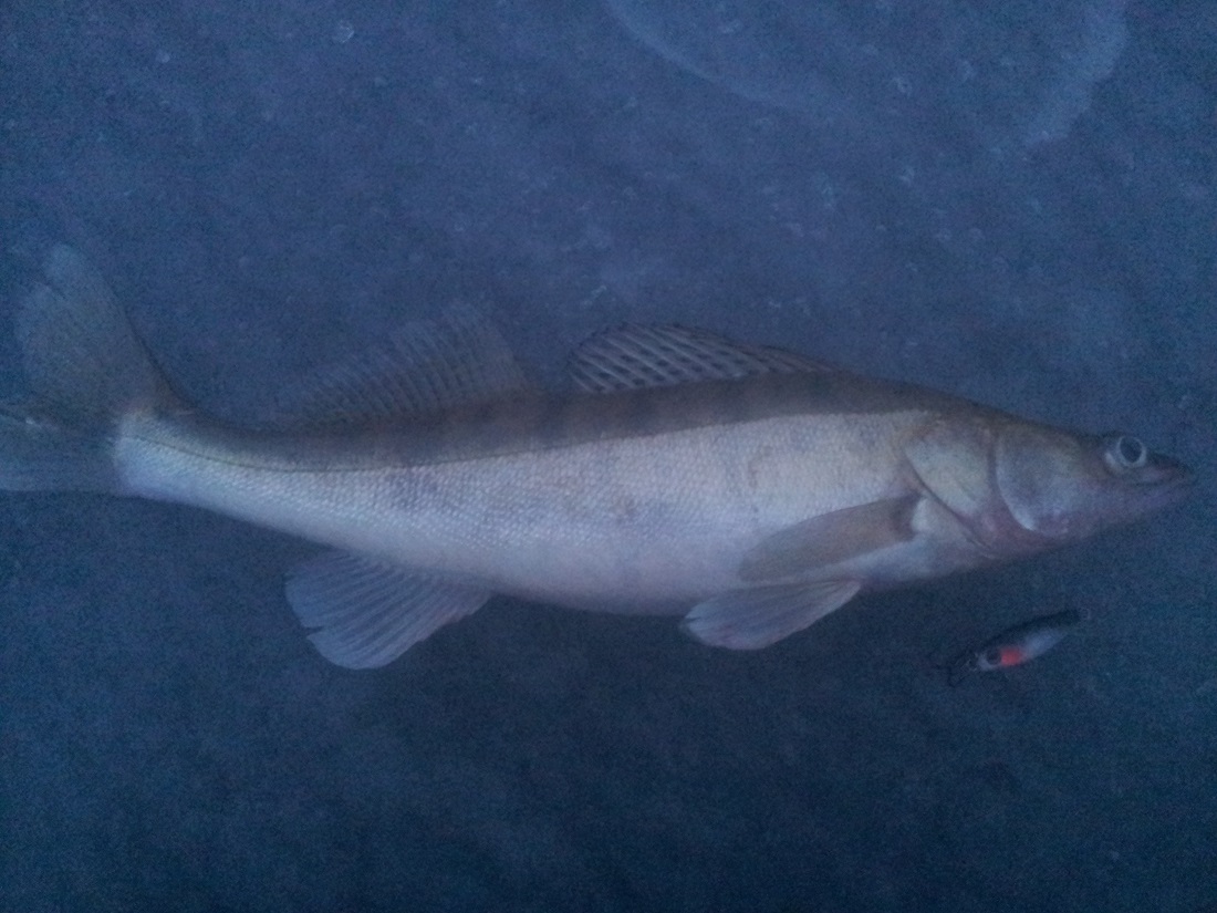 Сместился на метр глубже.И сразу же на свою тюнингованную блесну два судака