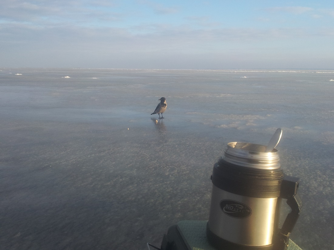 Волга. Ветер. Выходя на лёд, чуть не черпнул сапогом воды. Ходил, бурил. Поклёвок не видел.
