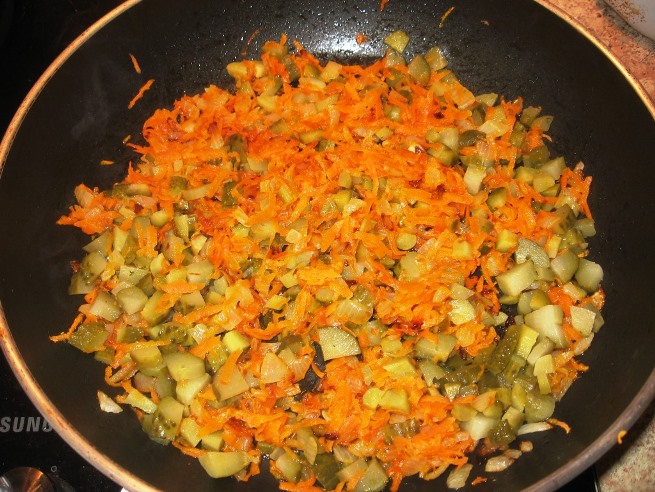6. Пассеруем на подсолнечном масле лук до золотистого цвета. 7. К луку добавляем морковь и также слегка обжариваем. По необходимости подливаем подсолнечное масло. 8. Следом добавляем нарезанные огурцы, перемешиваем с луком и морковью и жарим еще 3-4 минуты. 9. Затем добавляем к пассерованным овощам пол-банки томатной пасты, хорошенько все перемешиваем, накрываем сковороду крышкой и оставляем тушиться на 7-8 минут. 10. Отправляем полученную заправку в кипящую кастрюлю. Сразу же выливаем туда рассол из стакана. Перемешиваем бульон, варим 10-15 минут.
