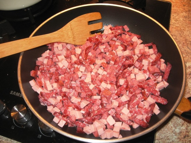 - 700г различных мясных вкусностей (вареная, полукопченая и копченая колбаса, карбонад)