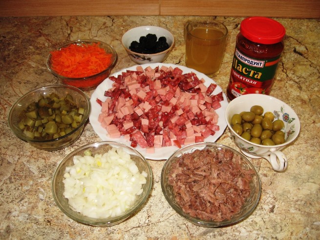 2. Слегка обжариваем на подсолнечном масле нарезку из мясных деликатесов (3-4 минуты). Они должны немного «отдать жирка». Отправляем их в кипящий бульон и варим их 8-10 минут. 3. Закидываем в кастрюлю оливки и чернослив. За время приготовления чернослив должен развариться до состояния желе.