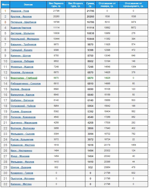 Он-лайн таблица с результатами взвешивания здесь: http://pal.sport-express.ru/results/pal2015-2etap/