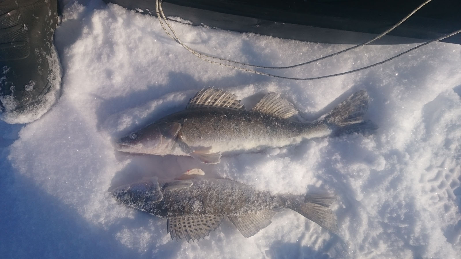 Продолжаю ловить на этой лунке, через пару минут опять поклёвка и мелкий бёршик на льду, отпускать не стал, хотя и надо было. Далее перехожу на следующую лунку, начинаю играть балансиром, и вдруг товарищ резко бежит к моей бершовой удочке, оказывается там на стоячку была такая поклёвка, что удочка чуть в лунку не ушла, товарищ подсекает, но на том конце уже пусто