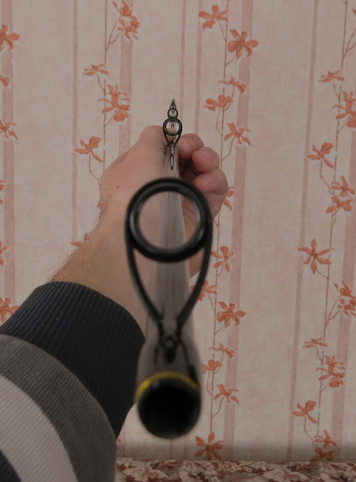 Комлевая часть с одним кольцом - антизахлёстом , на высоких опорах , ручка из пробки + ева , гайка верхняя , думаю катушки до 4000 по Дайве туда встанут нормально и достаточно удалённое кольцо , пусть и небольшое( порядка 16 мм в диаметре ) , не помешает нормальной работе . Есть складная петелька - крючкодержатель . Длина рукояти до катушкодержателя - 45 см.