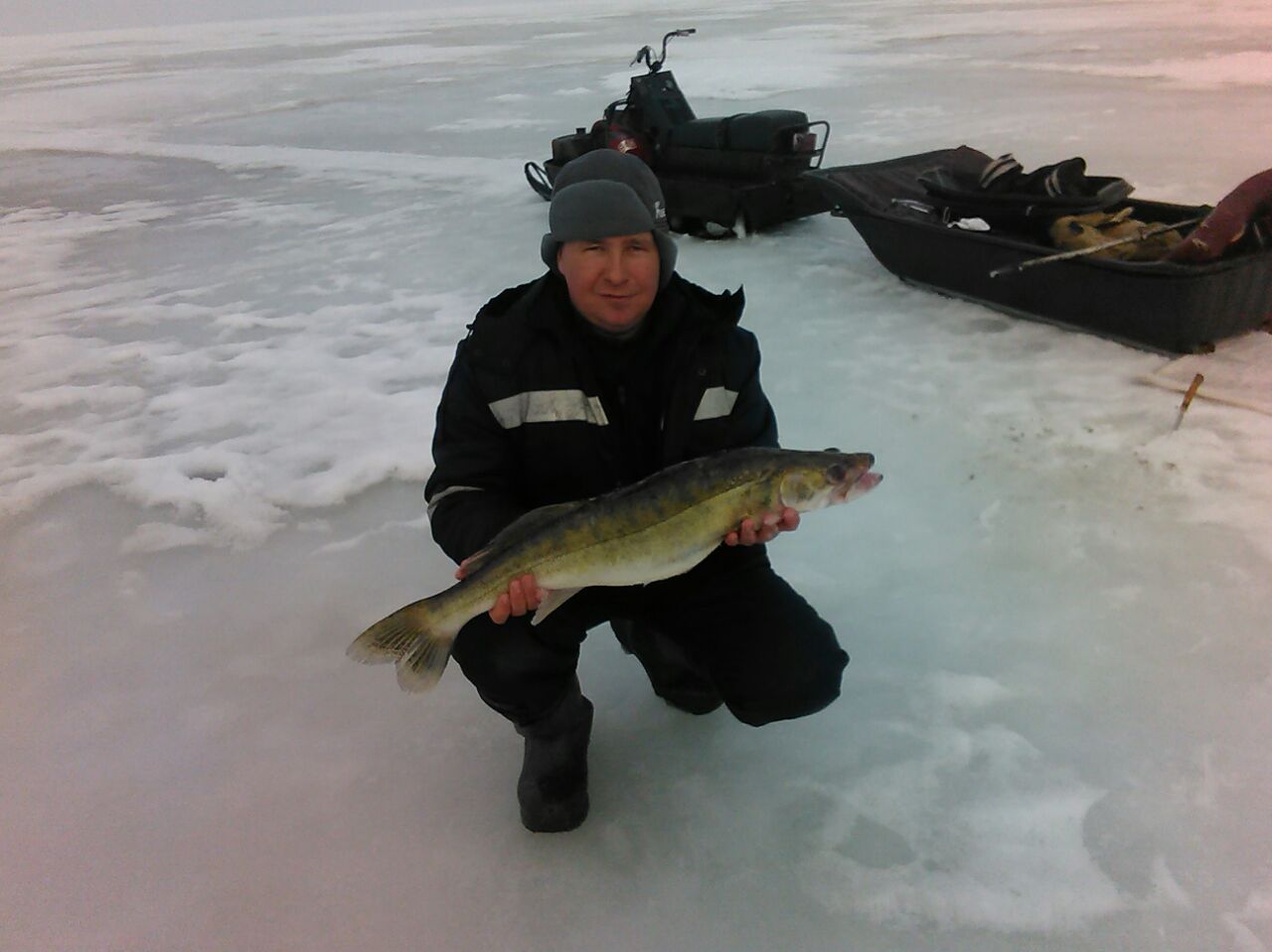 Поехали к народу - человек пятьдесят, десяток снегоходов. Глубина 1-3 метра. Там немного и поймали.
