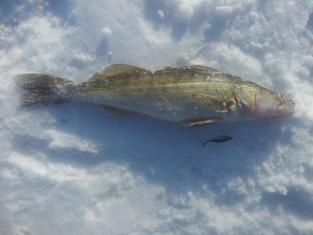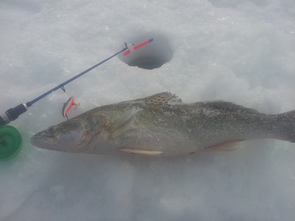 До 10 утра так наловил 9 судаков,после чего клев пропал.В течении оставшегося дня побродив по всяким точкам и поймав еще одного судака решил вернуться на утренние места.Покапав с десяток лунок,когда уже окончательно обессилел,все же дождался удара в руку.Подсекаю и приятная тяжесть,леска проскальзывает в руке,что-то не хочет пролезать в лунку и все же тихонько вылез из лунки судак на 1.7кг