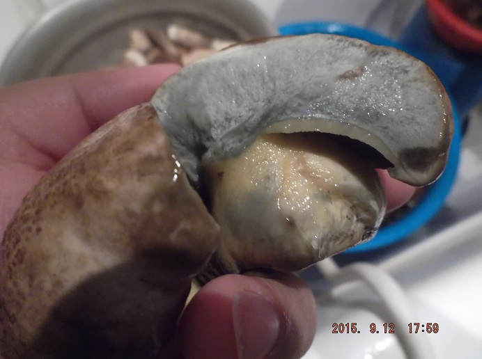 А что за гриб, который синеет на сломе? А сам такой же примерно по форме, но светлый весь... Губка желтая.