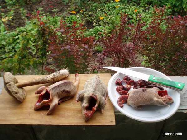 2. Ввиду того, что дичь у нас свежайшая, то сердце, желудки и печень мы тоже чистим, моем и мелко рубим с грибами. После этого всю начинку присаливаем.