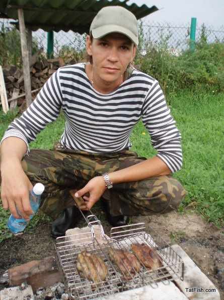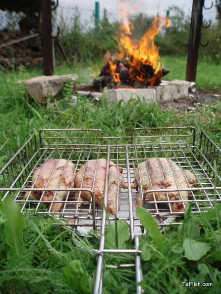 4. Тем временем наш костерок уже доходит, и мы укладываем подготовленные тушки на решётку и прижимаем второй половиной решетки-барбекю.