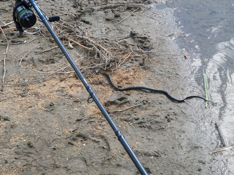 Утро с 5 и до 10, с перерывом в двадцатиминутный дождь, гибрид и язь цеплялись стабильно. Далее тишина... Ветрище... И, кульминация рыбалки - ошалелый уж, который выплыл и, уставившись на нас, решил, что необходимо шипеть и ползать в нашем садке, шарахая нашу рыбу по лбу