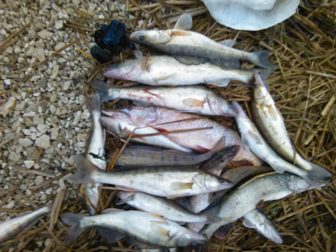 В итоге 20 кг на двоих. После 10 поиски и штучно мелочь. Вся рыба под белью! В улове и щука и судак. Средний вес около кило, максимум 2,65 судак у напарника.