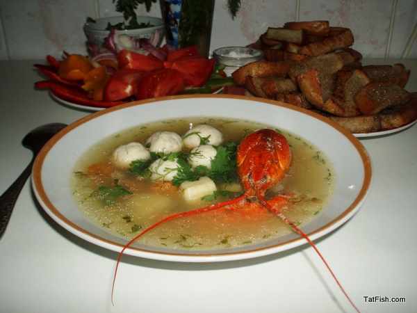 В приготовленный и процеженный через мелкое сито (марлю) бульон добавляем один-два мелко порезанных кубиками картофель и варим 10 минут. Осторожно опускаем в бульон фарш в «доспехах» и без них, клешни, а так же обжаренные до золотистого цвета на подсолнечном масле мелко нарезанные лук и морковь и варим ещё 15 минут. Сняв с огня, добавим немного укропа и накроем крышкой потомиться ещё минут 10.