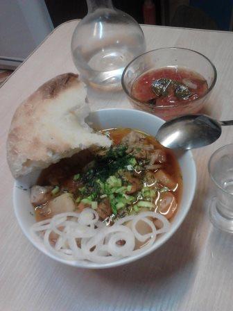 Картофель, нарезанный большими кубиками необходимо перед отправкой в казан обжарить в сковороде с маслом до небольшой такой корочки. Внутри он сырой будет, а снаружи как готовый должен выглядеть. Еще одну картофелину режем очень мелкой соломкой, но не жарим. Она пойдет в казан в сыром виде, но затем разварится и даст вязкость бульону. Нарезанный кольцами лук обжарим в масле до мягкости, добавим морковь и томатную пасту или помидоры (свежие, либо консервированные). После десяти минутной обжарки необходимо поставить это луковое варево в духовку на 100 градусов на час. Муторно, конечно, но это стоит возни. Мясо джейрана, если нет, то корова из Йошкар-олы тоже сгодится, кусочками только нарезать надо - обжарить в сковороде до небольшой корочки. Теперь в казан кладем готовый запеченный лук с томатной пастой, мясо и заливаем водой. Специи у меня это зра, соль, перец, немного сумах («сушеный гранат»). Паприку не надо, так как есть томатная паста. Час варим под крышкой. Далее закладываем обжаренный и соломчатый картофель и варим еще час. Готовое блюдо неплохо бы заправить зеленью и подать к нему стопочку дистиллята произведенного из инвертированного сахара. Сочетается это дело очень хорошо. Лепешку можно обжарить в сковороде с маслом немного и макать во время трапезы в само блюдо, приговаривая - «давай-наливай по второй». Запивать жирное и сытное блюдо после, следует зеленым чаем.