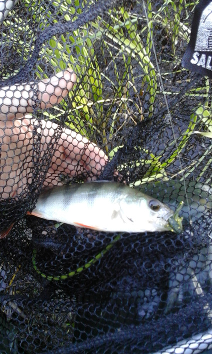 Что то небольшое сопротивляется на том конце шнура, подвожу рыбку к лодке, и вижу не крупного берша, который жадно зажевал приманку.) Настроение резко улучшилось, сердце ликует, начало положено