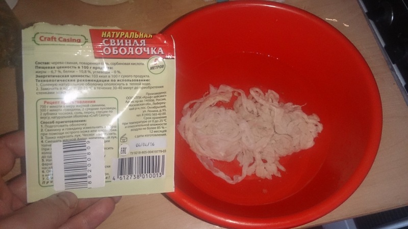 Покупаем свинину и говядину примерно 40% говядины, 60 % свинины с жирком, можно курицу еще взять. Чистим лук, чеснок. Делаем фарш, отдельно свинину с говядиной, отдельно курицу. Фарш солим, перчим, добавляем любимые приправы, хорошо перемешиваем и даем постоять мин. 40. В это время замачиваем в теплой воде свиную кишку. И вот теперь начинается самое интересное))) весьма эротический процесс, натягиваем кишку на насадку), первую кишку, когда натягиваем сразу ее не завязываем,а с начало включаем мясорубку и даем пройти немного фаршу, чтобы убрать воздух из системы, если этого не сделать, то кишка надуется, как воздушный шарик