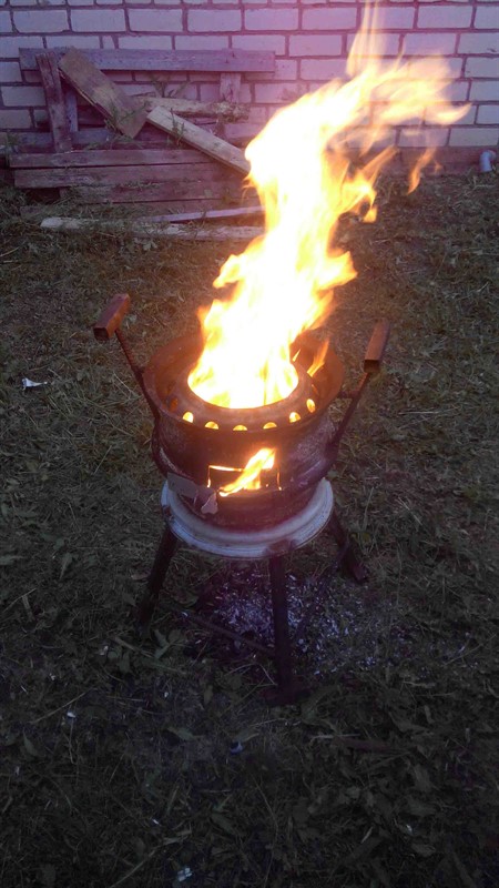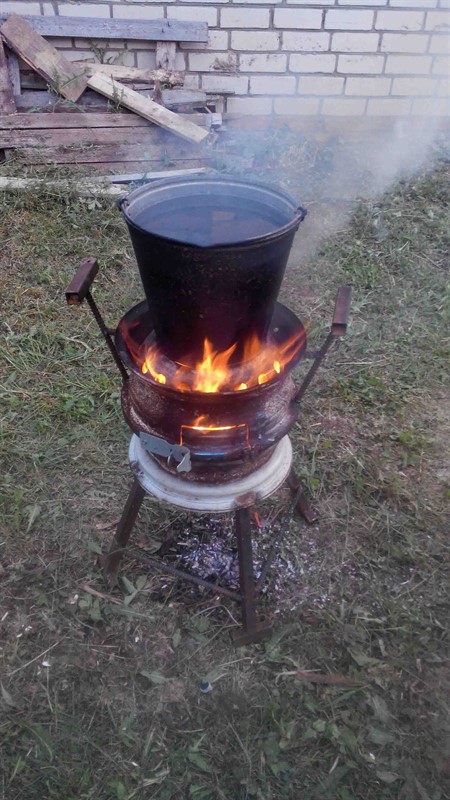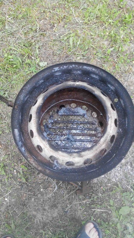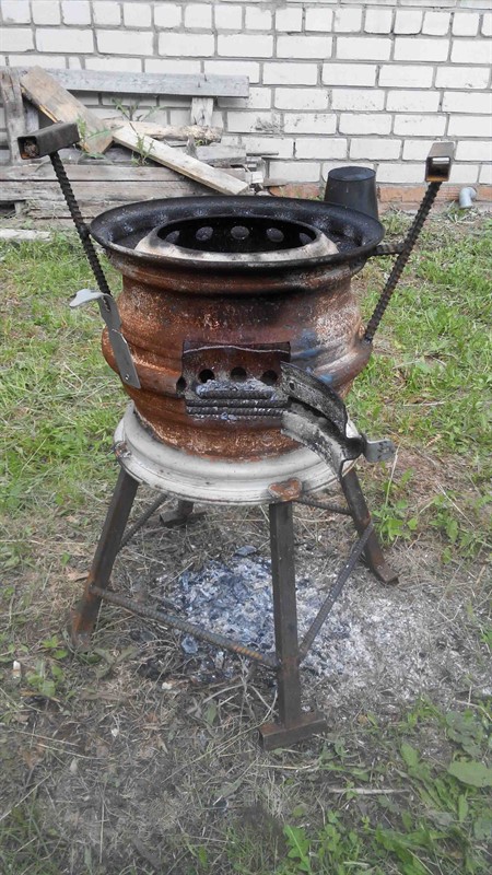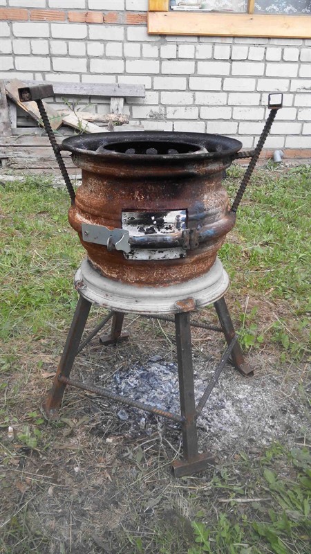 Изготовлена из 2х штампованных колесных дисков R13 для подогрева воды для дачного душа, но можно использовать для казана или котелка.