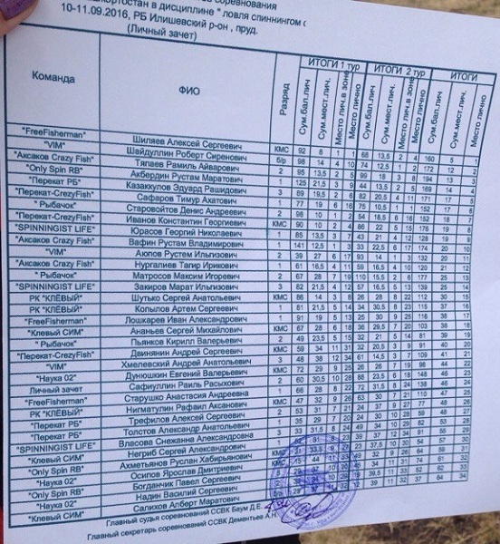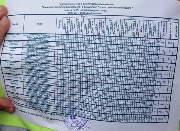 Технический протокол после окончания 3-его периода, как я и думал, активность рыбы к обеду значительно спала. В 4-м периоде удалось уйти от нуля всего 4-м спортсменам.