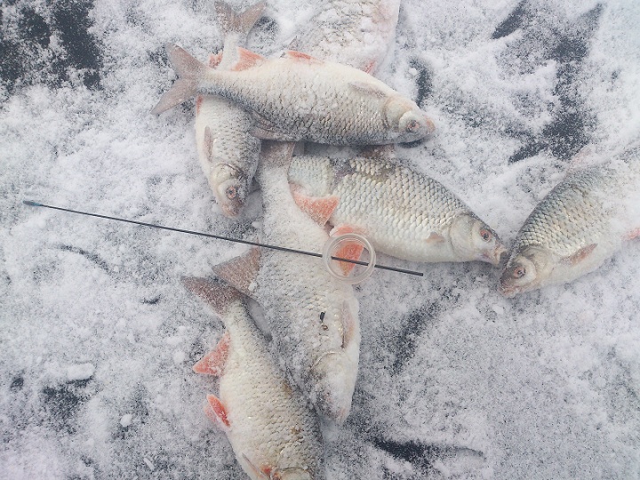 С таким клевом купленная микротюлька "ушла" за пару часов, а на запасы замороженной хищник клевать категорически отказывался. Иногда мою лунку посещали некрупные судачки, кого мог отпускал, ну, а кто не отцепился, тот как фильме замерзал на глазах. К обеду мне стало не на что ловить, попробовал ловить на ратлин без насадки, поймал сорок третью рыбку и засобирался восвояси, гордо тягая за собой целый пакет с мерным, сковородочным бершом