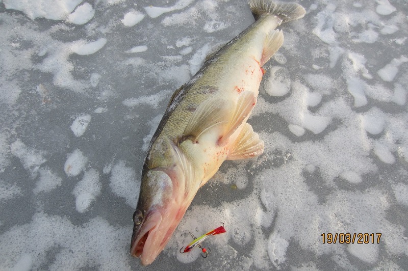 Воскресенье.Тяга уменьшилась вдвое.Рыбачить стало намного комфортнее,но и поклевок в течении дня было мало.Народ ближе к часу дня начал уходить со льда.Но мы все же досидели,примерно около трех дня судак на короткое время проявил себя в течении часа.Первая же поклевка и судак почти на трешку