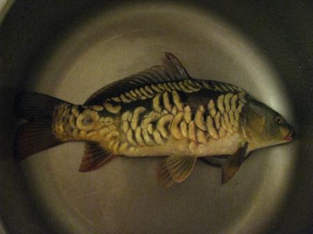 смотрю я на этого карпа, ну вроде кило есть, но какой то он облезлый весь, чешуя местами отсутствует, типа думаю больной наверное, взял показать смотрителю, домой брать и не собирался,