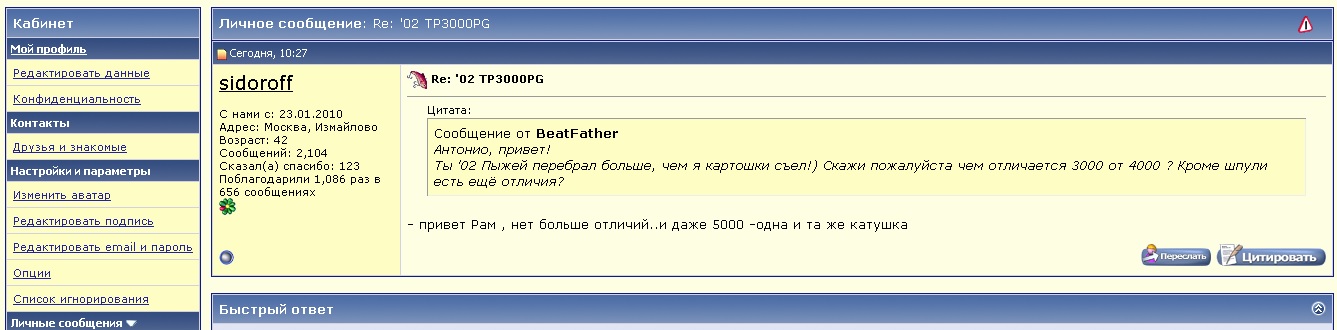различия есть не только в размере шпуль, но и в кишочках... я тоже сначала спорил с "Курборычем" НО практическое вскрытие и замер зубчиков и т.д. показали что у 3000 все таки кишки другие... 4000 -фореваSeTalPin писал(а):Возможно вопрос глупый, ну да ладно. Чем отличается 02 ПыЖик 3000 от 4000?