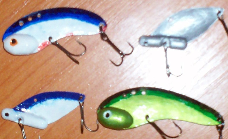 Сделал вот такие цикады , игра стабильная .Вес мелких 5 грамм , зеленая и белая около 16 грамм . В воскресение провел полевые испытания , все цикады рабочие . Были пойманы окунь, жерех и судак на 2,5 кг почти