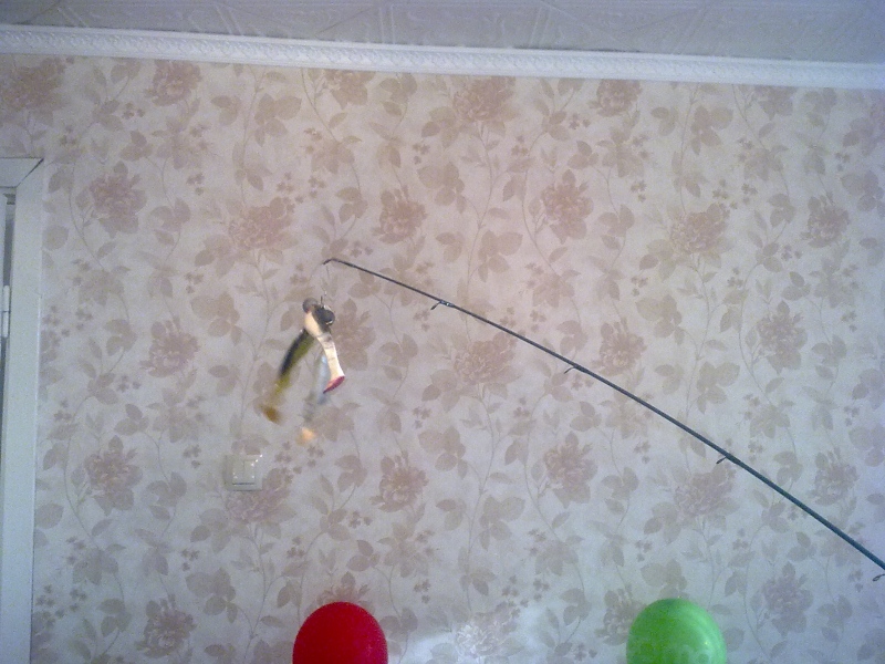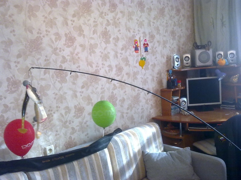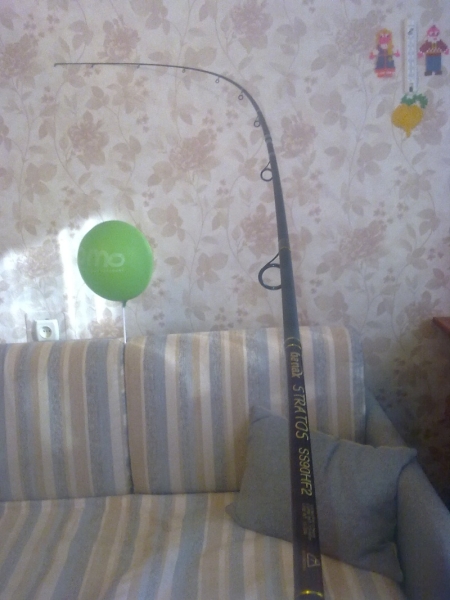 Ну и собственно упор в потолок,до предела,может еще бы погнулся,но пробовать дальше страшновато  P.S. палка на первый взгляд показалась дубовой,думаю без проблем забросил бы вес в 150 грамм,надо учитывать течение,сопротивление лески в воде,надо на воде пробовать