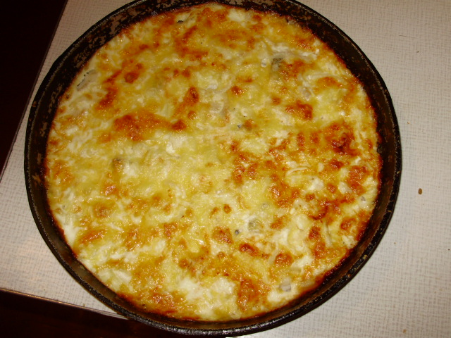 залил все это хозяйсво соусом(сметана 250гр+100гр воды+соль+специи+яйцо2шт)