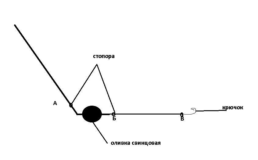 ну у него они для щуки)))) груз маленький и зафиксеный.. поводок короткий.... вот моя схема... леска 0.3-0.4 целиковая без узлов... оливка в зависимости от тяги ... ну обычно 60 грамм ставлю... монтаж плавающий... расстояние АБ =40 см, расстояние БВ 40-50 см... верхний стопор ставлю на таком растоянии чтобы рыба после проглота сама себя засекла если жерлица далеко стоит... все просто и понятно)))