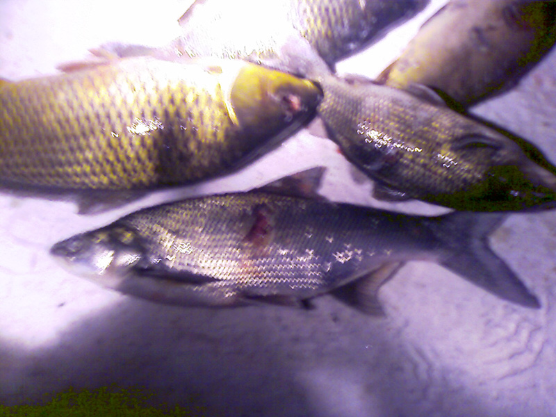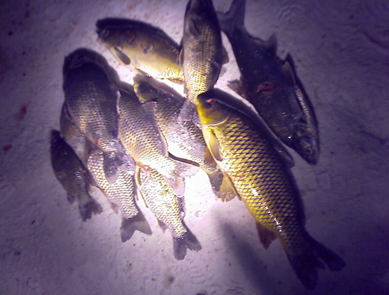 Запоздалый отчет за воскресенье 31.01.2010 г. Охотился ниже моста метров 150-200. Глубина от 0,5 до 1,5 м., течение сильное, много окуня - видел горбачей стоящих на течении, но взять не смог - течением сносит. Итог: штук 7 окуней грамм по 150-200, один сазанчик, поймал руками одного налимчика, видел много раков, но мелких. Вдоль берега под кустами рыбы почемуто не было, наверное из-за двух мудаков которые шастали по берегу. Вытащил одну сеть в которой было много тухлой крупной рыбы- щука, карась, голавль, окунь, руки бы оторвать этим уродам