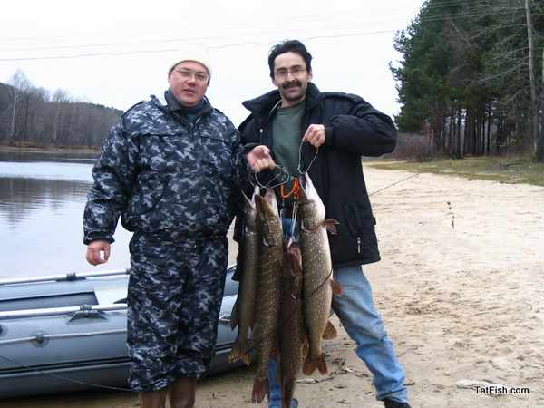 Он почти правильно все сделал, ну я подсаком  помог, и рыбка оказалась в лодке. Борьба длилась 3 - 5 минут. Долго мучаюсь с рыбкой, не могу никак посадить на кукан, руки мерзнут, еще сердце колотится от радости, наконец, Ринат поймал хороший экземпляр. Рыбка потянула на 4,9 кг, достойное закрытие сезона. Рустем все-таки ушел от нуля, взял щучку на 1,5 кг. Перекусив, решили ему помочь, но якорь никак не сдвигался с места, пришлось его срезать. Этот якорь на следующий день отблагодарил меня потерей приманки.