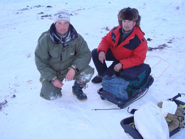 07.02.10 Мелькень первая деревня, дороги пробили во всех направлениях. Прежде чем ехать в темноте по не знакомым дорогам выходим из машины и смотрим на следы, вполне может быть что это тропа моторашек и прочей мото техники. Я доехал до игима и еще чуток подальше 8км от берега, лед от 30 до 0 см