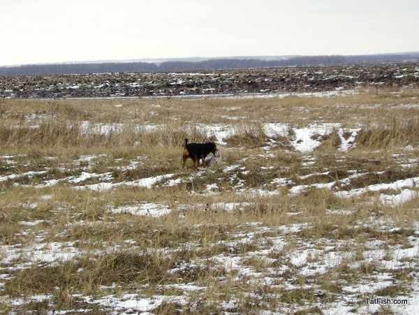 И так с рассветом, прыгая на заледенелых кочках, выезжаю на знакомую опушку. Сжигая энное количество калорий, тратим со своим четвероногим другом пару часов на обход знакомых точек. С удивлением обнаружил, что моё любимое место, с которого не раз снимал даже по два зайца за выход, оказалось буквально безжизненным. Так бывает, когда годом раньше предшествует высокая популяция зайца, но не сказать что к этому я был не готов. Передислокация приносит разочарования. Похоже, прогноз погоды изучал не только я и несколько раз подряд натыкаюсь то на охотников то на их следы, а время идёт. И на очередной встрече с конкурентами развернувшись на 180 градусов, ткнув пальцем в небо, уходим в свободный поиск по незнакомой пашне. Но тут сюрприз пашня оказалась бывшим капустным полем с остатками белокочанной. Отсутствие достаточного количества снега не даёт возможности читать следы, но присутствие ушастого налицо. Вот лист погрызенный, вот одиночный малик на скованном куске снега в приямке. Ищу глазами не кормовой участок, так как заяц редко ложиться в местах жировки и замечаю примыкающий участок пашни другого цвета. Так и есть, через 300 метров пашня после уборки хлеба. Вот тут то он и должен лечь подумал я, но телефонный звонок прервал мой бессистемный путь. Ну, как всегда на самом интересном месте. Ух уж эти женщины, жена волнуется. Излив друг другу душу, толкаю трубку за пазуху. Сделав два шага с ружьём на плече, а не в руках, краем глаза замечаю, как пёс стремглав летит от меня прочь. Вот досада, «косой», не выдержав моей остановки, срывается с лёжки за 70 метров от меня. А в момент моего выстрела он был и того дальше. Погорячившись, мажу, но пёс улетает по горячему следу и тает за горизонтом в седой осенней дымке. Жаль, что ходит он без голоса, но вероятно всё же круг в узёрку он за ним прошел. Так как пришёл он с противоположенной от угонного следа стороны и через 20 минут, но мои нервы не удержали меня на том месте, где мы подняли русака, и я пустился на поиски своей собаки.
