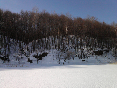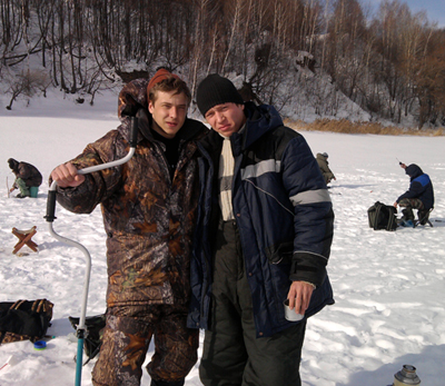 А я двинулся к острову, где тяга чуть поменьше и свал поположе.. С утра наст держал хорошо. Полчаса ловли возле острова не дали ничего и пришел к друзьям. Бурение лунок - жесть жестяная. Лед под изгиб рукоятки Барнаула, в некоторых местах приходится снег даже разгребать. Лед кашеобразный, вязнущий, последние 30-40 см. бурение по полоборота. Два часа ловли на секретном месте - как выразился Равиль - Алеша Попович(только без Тугарина Змея. Вернее змей(змий) был только зеленый). Если бы Равиль не предложил виски из своей волшебной бутылочки - настроение бы было хуже некуда. Потом пошли "копать". Были и меляки с глубиной в 3-4 м., и сидение перед и за сетями - ОП. Потом увидели,что в куче кто-то махает и двинули туда Но результат тот же - ОП. Дедок один вытащил судачка гр. на 700 на свою самоделку и все.Но он рассказал , что местные на буранах выезжают ловить около 16.00. Поднялся сильный ветер. Вернулись на свое первоначальное место и там увидели хоть несколько поклевок. Одну из них Юра реализовал в берша. Все. Потом перекус, который затянулся минут на 40