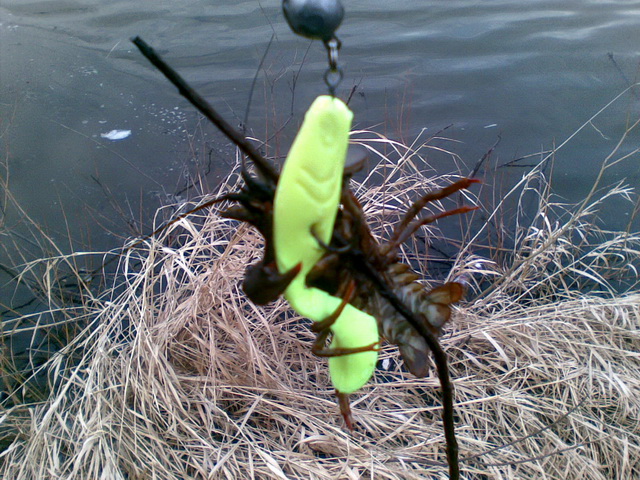 Сегодня был на Казанке рядом с мостом, пробовал по рыбачить на спиннинг, вода мутная, течение хоть и ослабла но все ровно 20гр джиги сносит, да нет нет да большие льдины с мусором плывут. Со второго же заброса удар, подумал что в начале всякий мусор цепляется, да нет на хвостике твистера появился порез. И все больше поклевок не было, были поклевки мусора и дна
