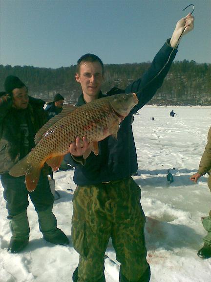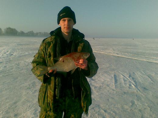 чудо шло сначала как фанерка,но потом стало упираться...повозились с ним минут пять,после чего я поднял доброго леща к лунке.Естественно в 130 он пе пролез,подхвачен багром и минут 20 я выдалбливал его пешней