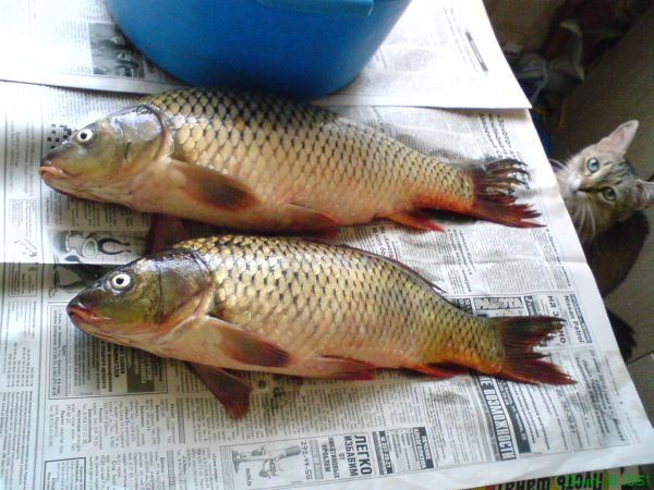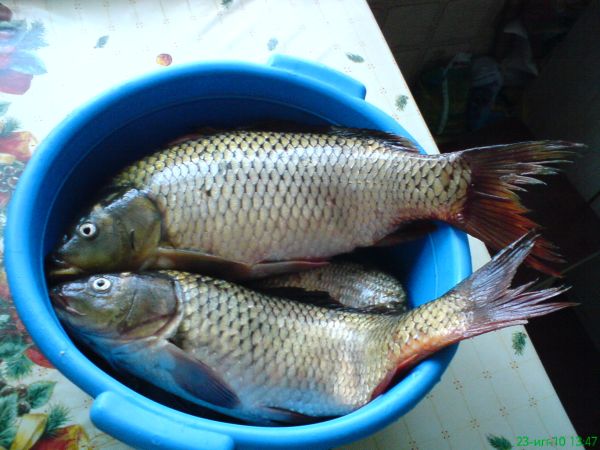 21.07-22.07 озеро 15 км от Арска. 2 карпа 600-800 гр, 3 сазанчика поменьше и много-много карася причем размер более чем сковородный, 4 обрыва лески и два схода чегото крупного (наверное сазан). Итого на двоих кг 4, причем карася с ладошку отпускали. 23.07-24.07 там же. вечером, ночью и рано утром карась вааще не брал. часов в 6 чуть стал поклевывать на фидер, на удочку вытащили штук 5 всего. Итог на пятерых 1 карпик и десятка 2 карасей. вроде один день прошел, а такая разница в клеве