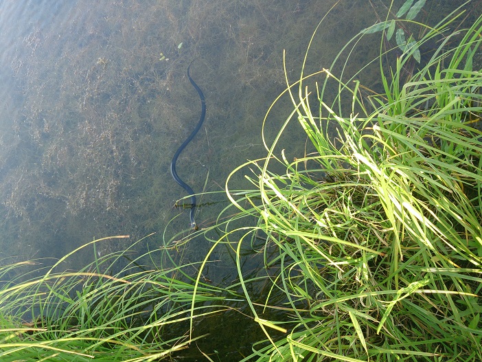 Место ловли: небольшой залив, в самой его мелкой части ( на глубине 30 - 40 см. ) грелась на солнышке уклейка, на которую делал набеги "полосатый". Казалось бы ничего трудного, но сложность составляло то, что дно густо заросло травой ( см.фото, на котором УЖ ). Было принято решение ловить на поверхностные приманки. Изначально в бой пошёл мелкий очень популярный попер Tiny - Tip от компании Duel, но к сожалению он напоминал уклейке атаку окуня, от чего та в свою очередь бросилась в рассыпную, а вместе с ней исчезли окуни. Вот лошара!