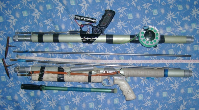 Первое пневмат темпест 50 (надо было 60 брать), уже менял разлетевшийся поршень( выстрел под водой был). Второе и самое любимое - арбуль экскалибур спорт 60, говенный зацеп выкинул, поставил самодельный усиленный (в прозраке лучше не придумать, длинна, для меня, самое то!). Сейчас пневмат переделан для добычи крупной рыбы: самодельная мощнейшая катуха, дельный амортизатор, паплавки для придения нейтр. плавучести (т.к. катуха целиком из металла + хомуты итд), манёвренность не сильно пострадала.