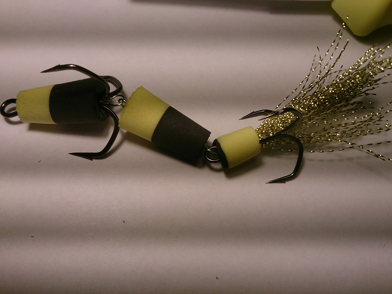И еще: делаю сегменты поплотнее между собой, игра остается перехлестов меньше. И на крайний тройник делаю побольше плавучесть. Если на тяге то и как на фотах достаточно, а если тяги нет то хвостик начинает опускаться при падениях. Я просто на последний тройник побольше сегментик делаю. В банке проверяю, или в аквариуме чтоб хвостик вверх держался.