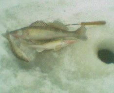 Остальные проруби приносили как правило одного-двух клыкастых.Правда сместившись ближе к 11 часам на фарватер,если сейчас это можно назвать глубину в 11 м....наткнулся на вполне порядочного берша...до 500-600гр.