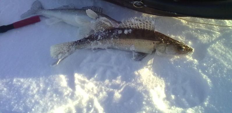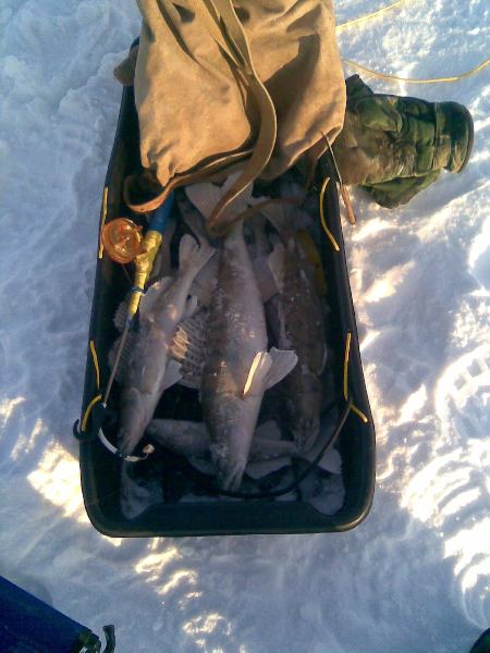 На льду холоднее, чем в городе. Посидел немножко на глубине 9-10 меров, слабая тяга. Не понравилось, мелкий судачек. Ушел дальше в сторону прорана, бровка с 4 метров до 8 метров. Тяга посильней, с первой же лунки судачек под кило, по совету Doctora, игра блесной проходила в 1.5 метра от дна, судак клевал с ударом, потом бурил, бурил, ловил, опять бурил, взял еще судака на 1.5 кг, ну мелочишки немного, в перерыве между чаепитием решил фото сделать, пока телефон не замерз совсем.