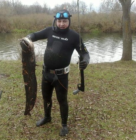 проверяли с Инсафом свое секретное место прозрак метра 2 уже каждая коряжка каждая ямка знакомы. взяли немного крупного судака и подстрелил одним выстрелом 2-х сомиков. А дело было так уже проверев каждое бревнышко собирались вылазить из воды так как уже замерзли, ну думаю дай на последок нырну разок и уже когда воздух закончился и пора всплывать щамечай морду сома который сидел в бревнах. Ну думаю стрелять не стоит всплыву отдышусь не куда он не дениться. очередной нырок ищу своего сомика а его нет уже на месте заглядываю в нору в которой он сидел смотрю хвост торчит стреляю всплываю,ослабляю катушку до конецто ее поставил отдыхаю на поверхности и снова ныряю и смотрю на лине сомик а нарпун гдето в норе тяну за линь и тут появляеться второй сомик на гарпуне по более первого линь запутали они конкретно обоих в руки взять не получаеться хорошо что инсаф был рядом и помог вылезть на берег с обоими. фото не получаеться добавить .