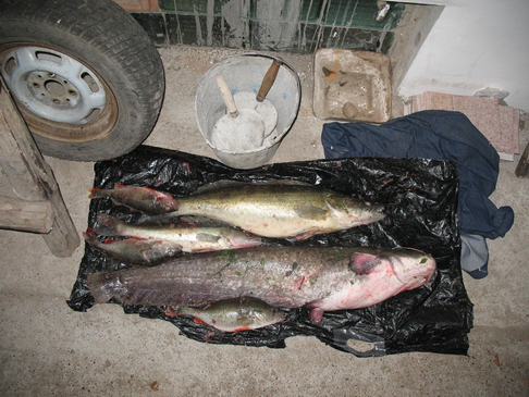 Ну а мы с Ильдаром очередной раз постреляли сомиков, судаков, щук, окуней и налимов... У Ильдара итог 16 кг. рыбы (молодец), у меня много меньше 7 кг, из них 1 сомик на 5,5 кг, щучка и пара окуней.